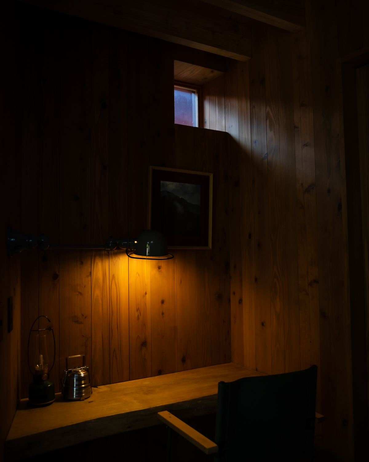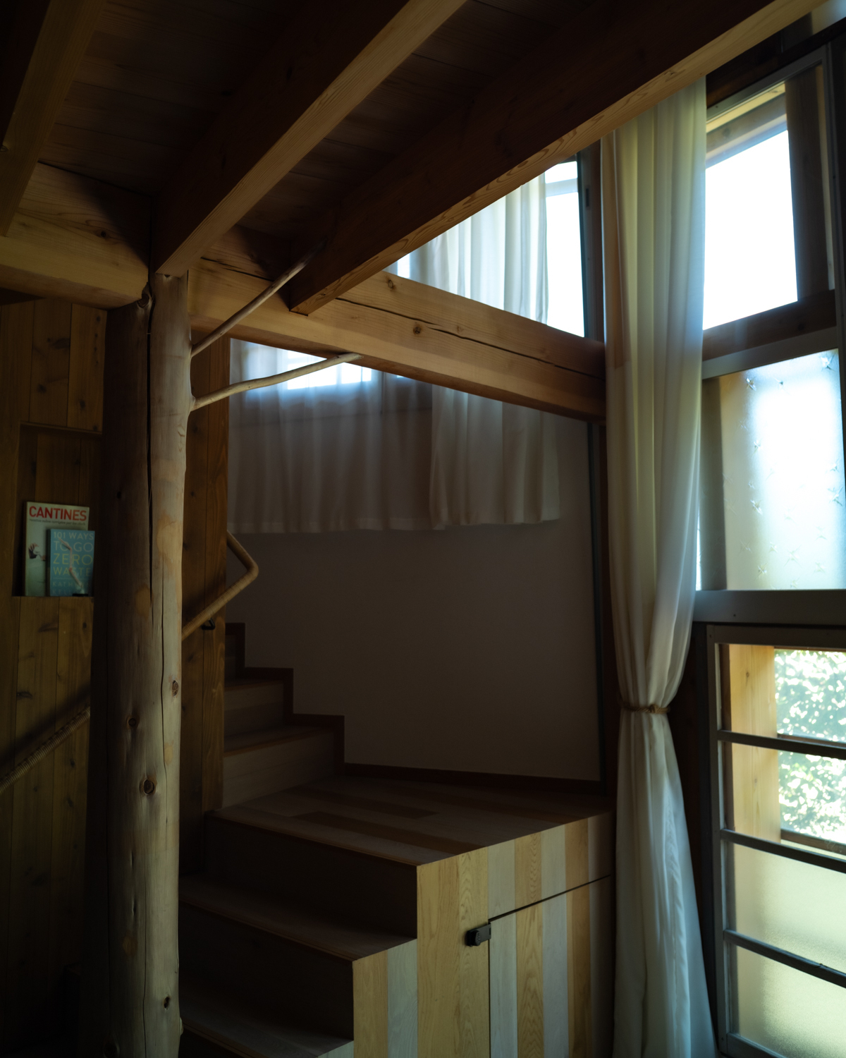 ロッジのような客室。階段の本はキャスリン・ケロッグ著の「101 Ways to Go Zero Waste」セバスチャン・ドモランの写真集「Cantines : Recettes cultes corrigées par les chefs」