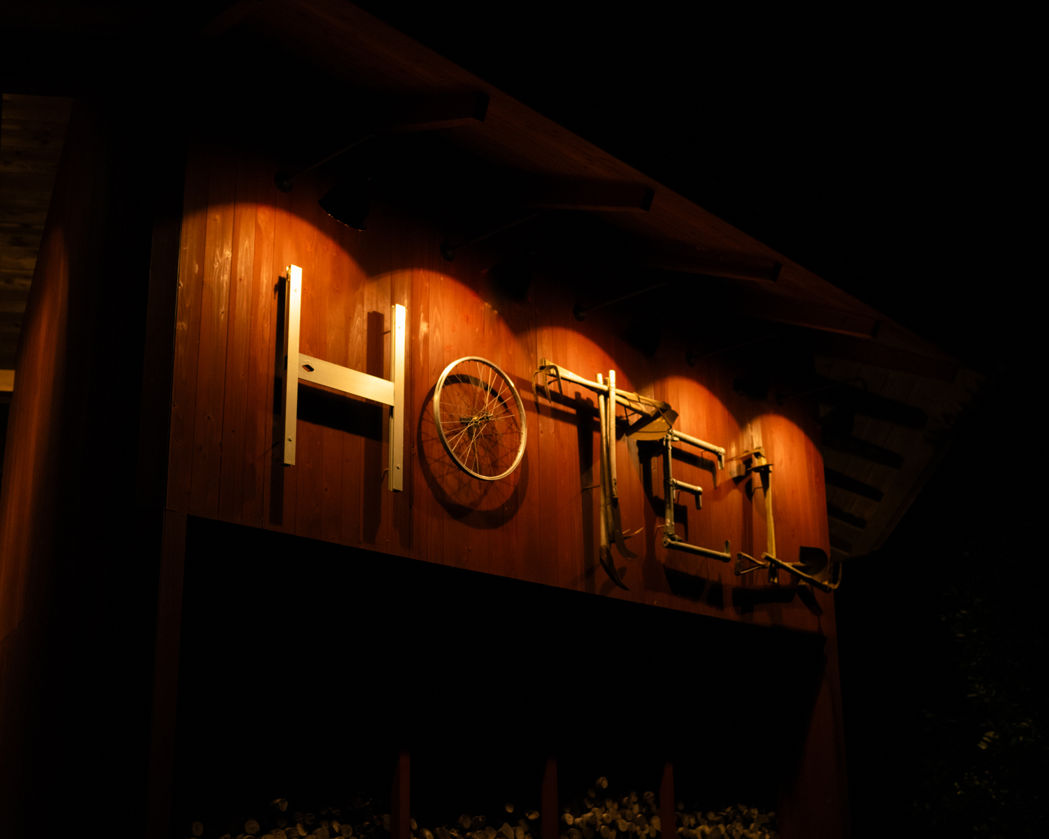 ホテルのサインも車輪や農具、引き戸などをリユースしている。