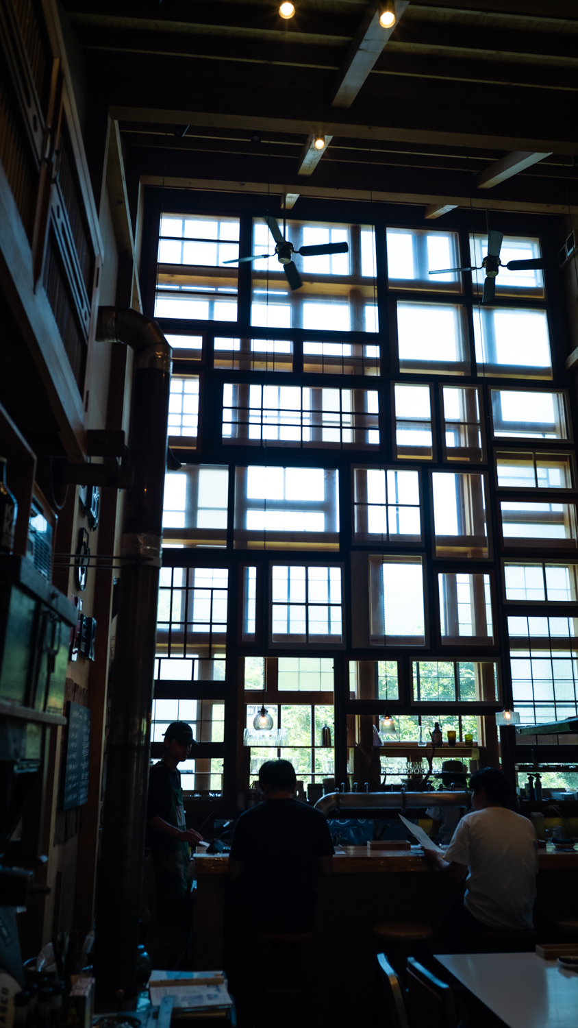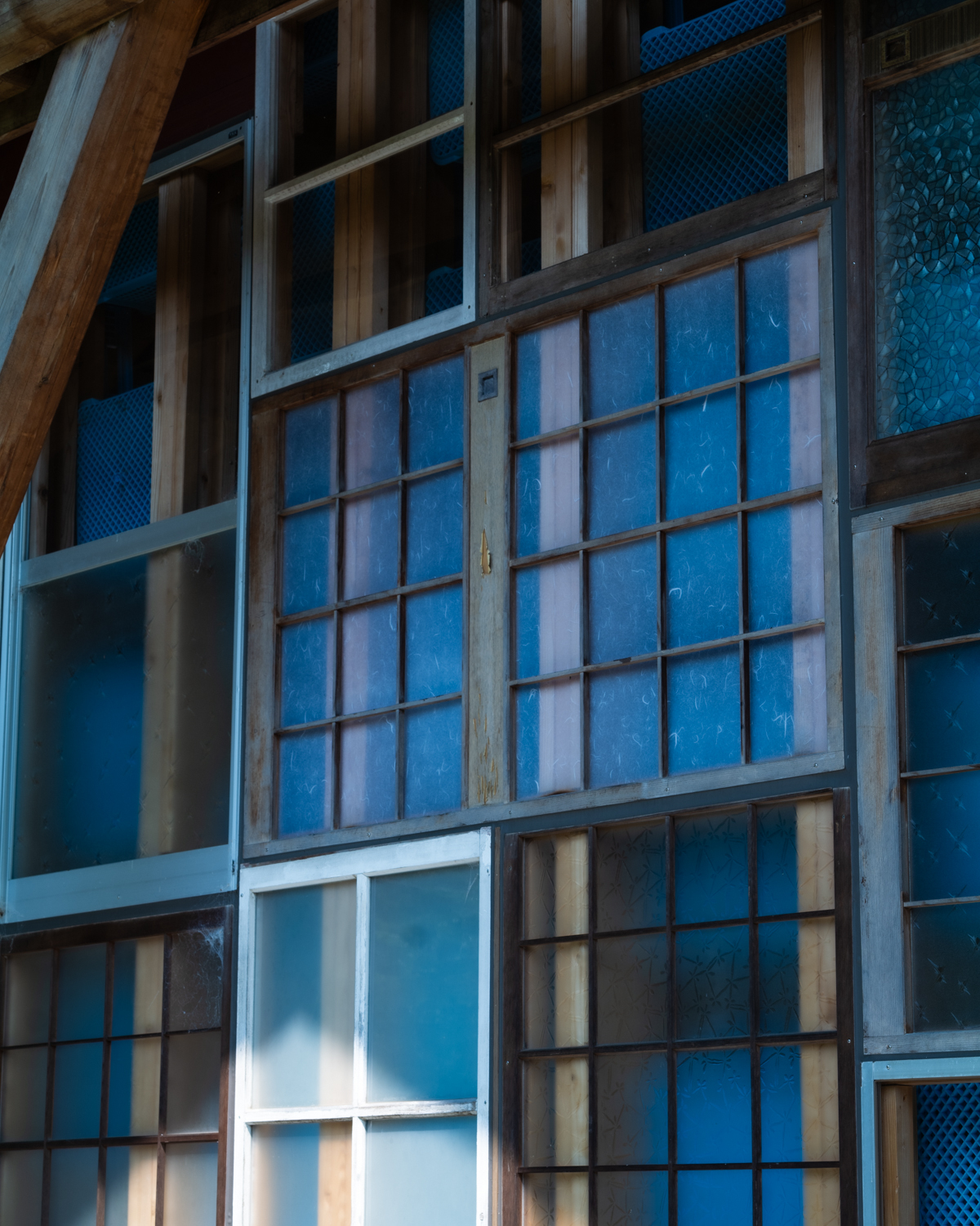 また、廃材を出さない支柱とそれを止めるボルト、上勝町から集めたガラス窓や戸を再利用した象徴的な壁面、清酒ケースのデスク、ガラス瓶のシャンデリア、一塗缶を再利用したベンチ、瓦を再利用した縁取など、建物の形状や建築技法、あらゆる細部にゼロ・ウェイストの理念に沿って考え抜かれたデザインが宿っていました。