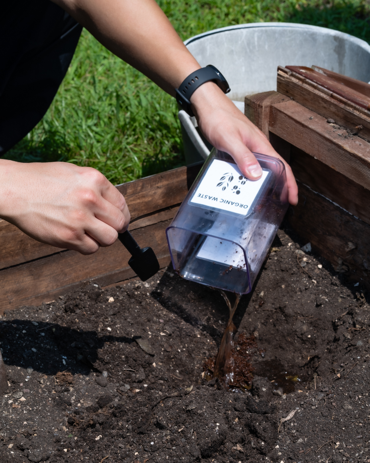 茶葉とコーヒーかすをコンポストに投棄。コンポストの形状や捨てる手順を守ることで効率よく堆肥化されるそう。
