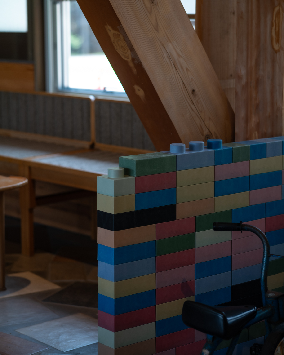 リサイクルで生まれかわったプラスチックブロックのおもちゃ。奥にはカーペットを再利用したベンチ。