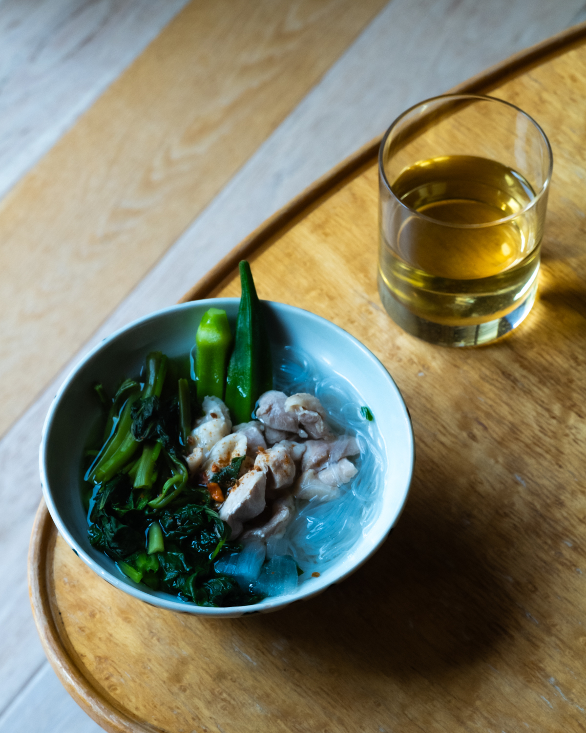 朝食は自分で温めて作る春雨麺のスープ。小松菜、オクラ、ホウレンソウ、モロヘイヤの旬野菜を添えて。