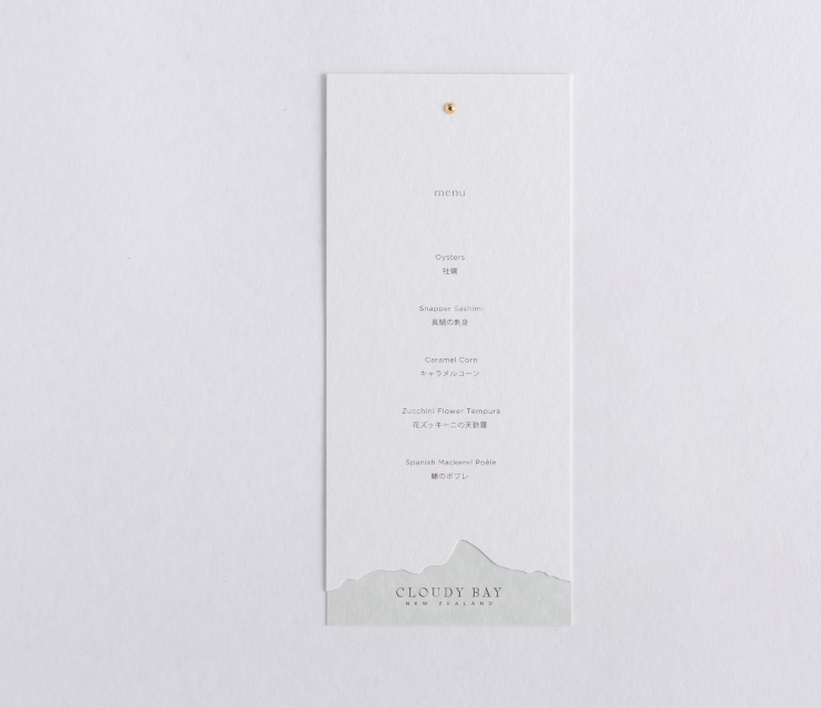 LVMHグループのワインブランド「CLOUDY BAY」の野外PRイベントのグラフィックツール(招待状、封筒、メニューリスト、席札)のデザインをさせていただきました。